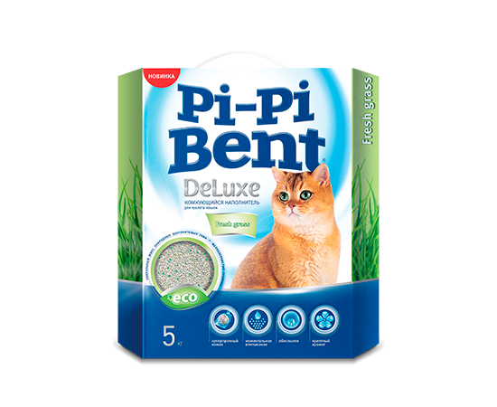 Комкующийся бентонитовый наполнитель супер-премиум класса Pi-Pi Bent Deluxe с новым оригинальным ароматом Fresh grass (Свежая трава), обладающий повышенной привлекательностью для животных.
