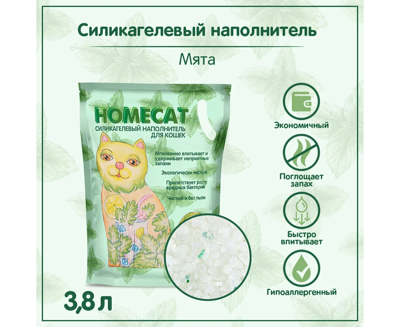 Наполнитель для кошачьих туалетов HOMECAT силикагелевый с ароматом мяты 3,8 л представляет собой современное решение для прогрессивных владельцев домашних кошек. Он устраняет причину неприятных запахов навсегда, придавая вашему дому ощущения чистоты и свежести.