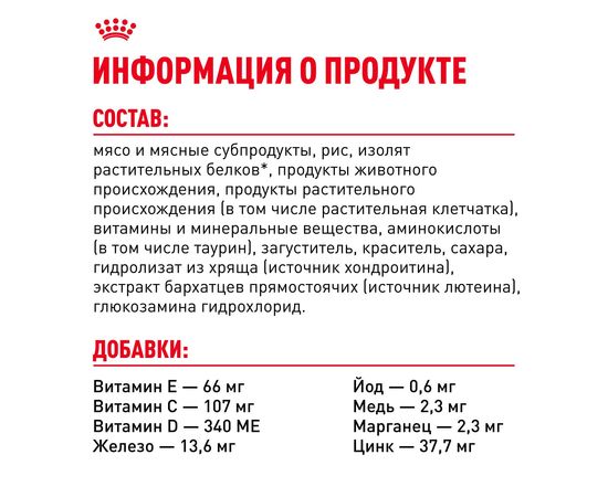 ИНГРЕДИЕНТЫ: мясо и мясные субпродукты, рис, изолят растительных белков*, продукты животного происхождения, продукты растительного происхождения (в том числе растительная клетчатка), витамины и минеральные вещества, аминокислоты (в том числе таурин), загуститель, краситель, сахара, гидролизат из хряща (источник хондроитина), экстракт бархатцев прямостоячих (источник лютеина), глюкозамина гидрохлорид.