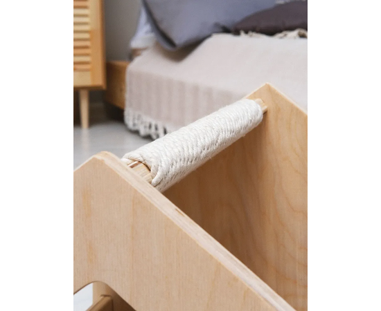 Домик для кошек выполнен из натуральных материалов высокого качества: березового шпона и хлопкового каната. Хлопковый канат производится из волокон растительного происхождения. Белоснежный мягкий материал с аккуратным плетением и приятным матовым блеском является самым крепким и долговечным в категории натуральных. Его безусловные плюсы – отсутствие мусора при использовании и специфического запаха. Березовый шпон (фанера) обладает высокой прочностью, гладкостью и, бесспорно, эстетичным внешним видом, а водоотталкивающая пропитка защищает его от пыли и бактерий, сохраняя природный рисунок.