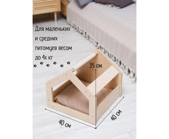 Вес изделия составляет 5,4 кг, размер в собранном виде - 40 x 40 x 35 см, размер подушки из мебельного велюра на синтепоне - 37 x 34 см. Домик для кота прост в сборке: крепежные элементы и инструкция входят в комплект, видео руководство размещено в карточке товара. Домик для животных подойдет питомцам небольших и средних размеров весом до 4 кг.