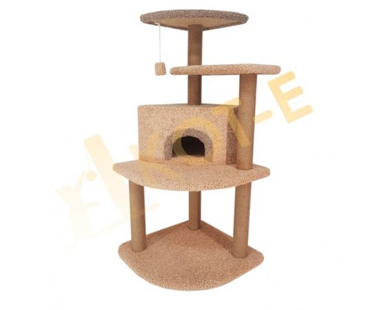 Размеры: 60х60х133 см. Размер домика 40х40х30 см. Размеры верхней полочки 40х40 см. Размер средней полки 25х60 см. Диаметр столбиков 8,5 см. Материалы: ковролин, джутовый канат.