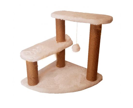 Размеры: 60х60х79 см. Размер полочек 30х60 см. Диаметр столбиков 8,5 см. Материалы: искусственный мех, джутовый канат.
