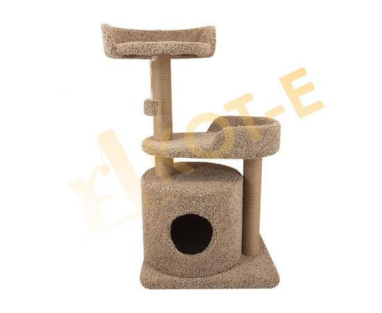 Размеры: 45х55х103 см. Размер домика 40х40х35 см. Диаметр верхней полки 40 см. Размер средней полки 30х55 см. Диаметр столбиков 8,5 см. Материалы: ковролин, джутовый канат.