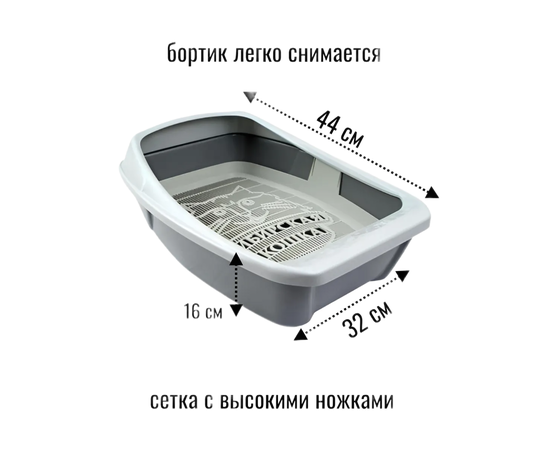 Лоток подходит как для взрослых кошек, так и для маленьких котят, что делает его универсальным выбором для любого домашнего питомца. Сетка в конструкции позволяет использовать как с наполнителем так и без наполнителя . Бортик предотвращает разбрасывание наполнителя за пределы лотка поддерживая чистоту в вашем доме.