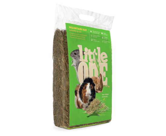 Горное сено Little One — ароматное, очищенное и высушенное, собрано в экологически чистых горных районах. Сено является основной составляющей рациона всех травоядных животных (кроликов, морских свинок, шиншилл, дегу), поэтому важно обеспечить его постоянное наличие в клетке. Сено Little One имеет разнообразный ботанический состав. Оно богато грубой клетчаткой, что необходимо для здоровья зубов и оптимального пищеварения декоративных животных. Так как животные могут зарываться в сушеной траве и строить из нее гнезда, сено также служит прекрасной подстилкой и развлечением для всех домашних питомцев.