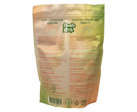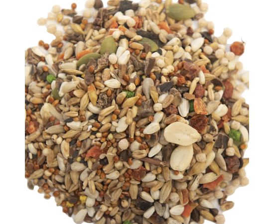 Состав: семена злаковых культур, просо красное, просо желтое, сафлор, овсяная крупа, семена конопли, семена подсолнечника, канареечное семя, сорго белое, сорго красное, гречиха, кукурузная мука, пшеничная мука, арахис, семена льна, плоды рожкового дерева, семена тыквы, рябина, семена травянистых растений, морковь, ракушка морская.