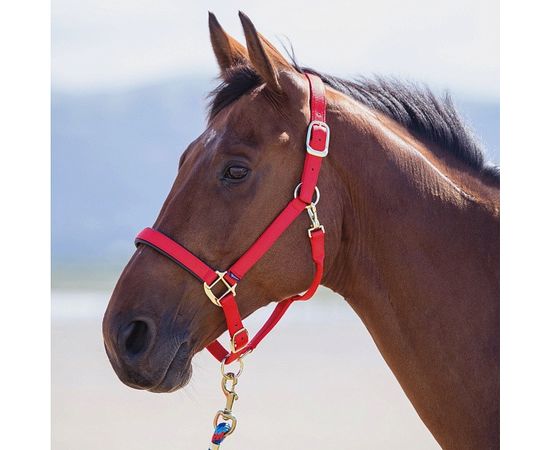 Яркий недоуздок из мягкого двухслойного нейлона оснащен регулировкой на носу и на затылке, а также имеет карабин для быстрой фиксации. Фурнитура латунного цвета.