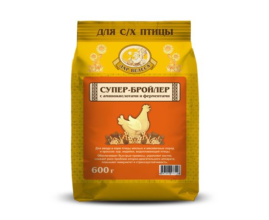 Премикс "Дар Велеса" Супер-Бройлер предназначен для балансировки рациона бройлеров и другой мясной птицы (утки, гуси, индейки, цесарки, перепела, страусы, и др.) по витаминам, минералам, аминокислотам, питательным веществам, для улучшения переваримости и усвоения кормов, для повышения продуктивности и привесов.