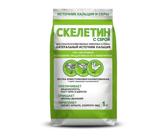 СКЕЛЕТИН с ФОСФОРОМ используется в качестве ежедневной кормовой добавки для балансировки рациона по кальцию и фосфору у птиц и животных всех видов и пород в любом возрасте, особенно при недостатке кальция и/или фосфора в рационе, при рахите, остеопорозе, хрупкой и тонкой скорлупе яиц.