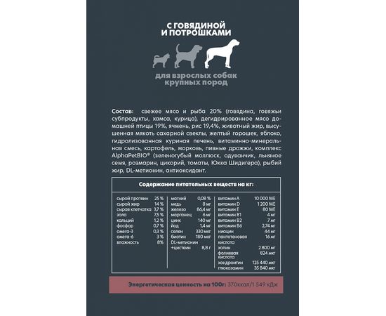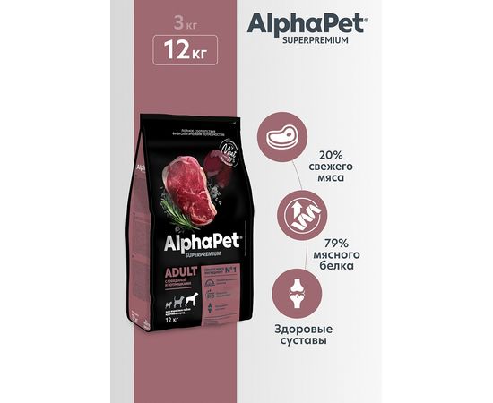 Корм AlphaPet Superpremium для собак крупных пород, с говядиной и потрошками, 12кг