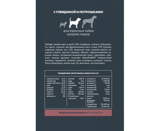 Сухой полнорационный корм с говядиной и потрошками для взрослых собак средних пород AlphaPet® Superpremium
