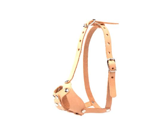 Намордник из натуральной мягкой кожи с открытой мочкой носа, защита от собирания мусора с земли, отверстия для вентиляции, дополнительный налобный ремешок.