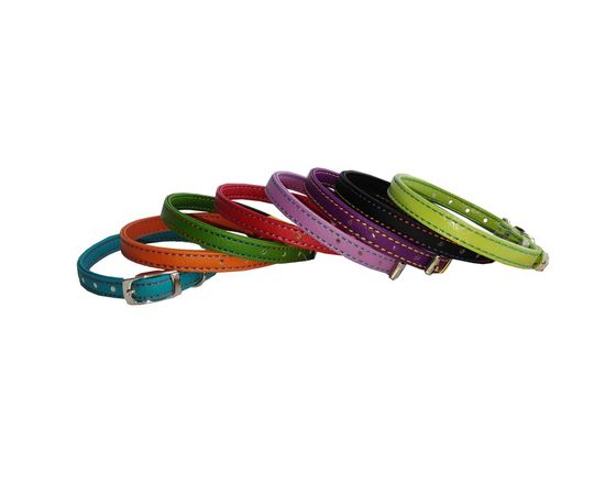 Ошейник из 4-х слоев мягкой искусственной кожи, проклеенный и прошитый декоративной строчкой, края в загибку. Полукольцо у пряжки. Цвета в ассортименте.
