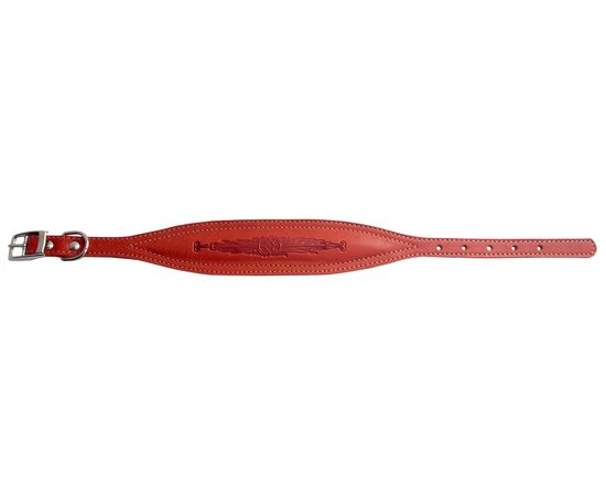 Ошейник-борзятник с тиснением, изготовлен из 2-х слоев мягкой натуральной кожи, прошит декоративной строчкой, полукольцо у пряжки. Предназначен для собак с длинной нежной шеей, таких как такса, левретка, борзая и т.п.