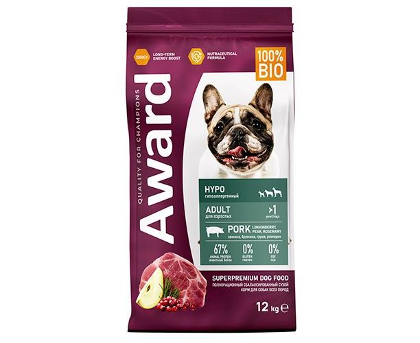 Award (Авард) HYPO - полнорационный сбалансированный гипоаллергенный корм для собак всех пород со свининой с добавлением брусники, груши и розмарина.