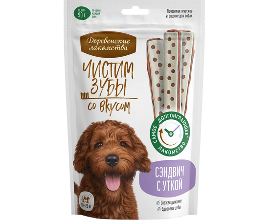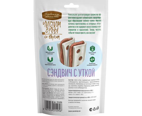 Супер-жевательное лакомство «Сэндвич с уткой» эффективно удаляет зубной налёт, предотвращая образование зубного камня. Мясная начинка приготовлена из отборного филе утки и не содержит искусственных консервантов и красителей. Теперь чистить зубы не только просто, но и вкусно!