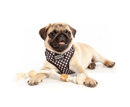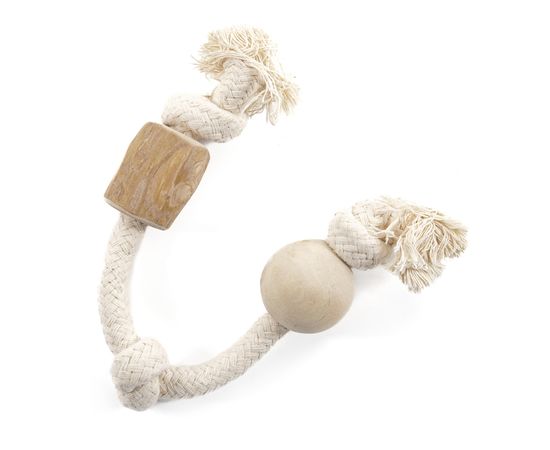 В этом варианте игрушки шар из кофейного дерева и кофейный бочонок нанизаны на прочную натуральную веревку из хлопка и закреплены узлами на её концах. Такая модель особенно придется по душе взрослым собакам мелких пород и щенкам и подросткам средних пород, которые любят не только погрызть, но и пожевать и потрепать свою «жертву». Пригодится игрушка для прогулки на свежем воздухе и игры в перетягивание. Вы можете тянуть, бросать, отнимать веревку с бочонком, а ваш четвероногий друг с радостью и энтузиазмом поддержит такое развлечение. Канатик из хлопка безопасен для собаки и также помогает бережно и аккуратно очистить зубной налет прямо во время игры.