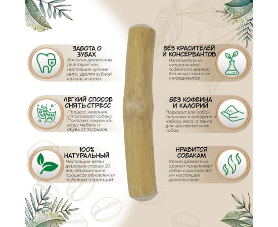 Грызть и жевать – совершенно нормальный инстинкт и видовая особенность любой собаки. Однако это привычка не раз доставляла хозяевам неожиданные неприятности, когда любимец умудрялся сгрызть предметы домашней обстановки, например плинтус, краешек стола, ножку стула, сжевать тапочки, одежду и даже носки. Чтобы удовлетворить такую естественную, но столь разрушительную потребность, разумным и современным выбором станет Coffee Wood. Эта деревянная палка надолго увлечет песика и обеспечит здоровые, приятные и долгие погрызушки. Четвероногий друг получит удовольствие от ежедневного ухода за зубами, будет защищен от риска стоматологических заболеваний, а ваша любимая мебель не пострадает от острых клыков.