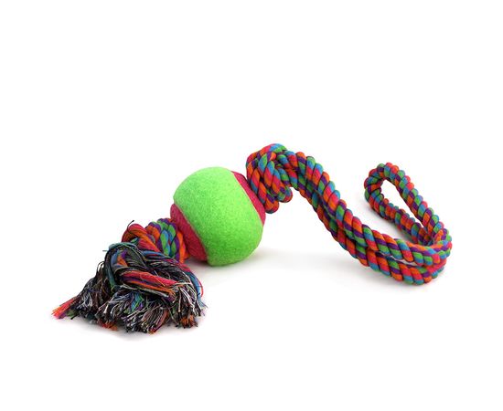 Веревка-восьмерка цветная с мячом предназначена для тяговых игр с собаками. Хорошо развивает челюсть собаки. Выполнена из 100% натуральных материалов. Цвет: разноцветный. Вес: 130-140г. Длина веревки: 450мм. Размер мяча: d65мм.