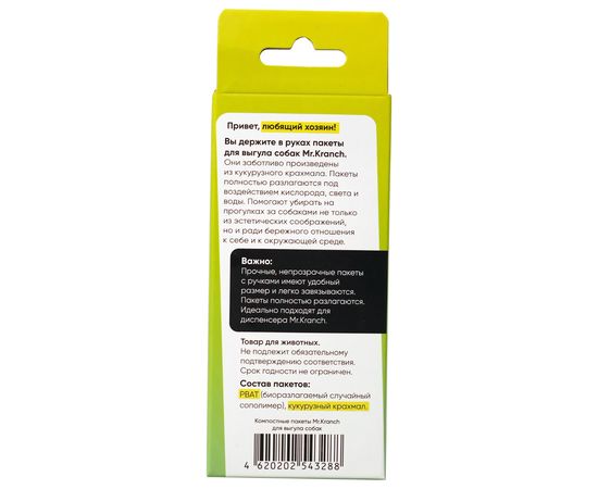 Компостные пакеты Mr.Kranch для выгула собак. Произведены из кукурузного крахмала. Пакеты полностью разлагаются под воздействием кислорода, света и воды в течение 30-70 дней. Помогают убирать на прогулках за собаками не только из эстетических соображений, но и ради бережного отношения к себе и к окружающей среде. Идеально подходят для диспенсера Mr.Kranch. 1 коробка - 60 прогулок.
