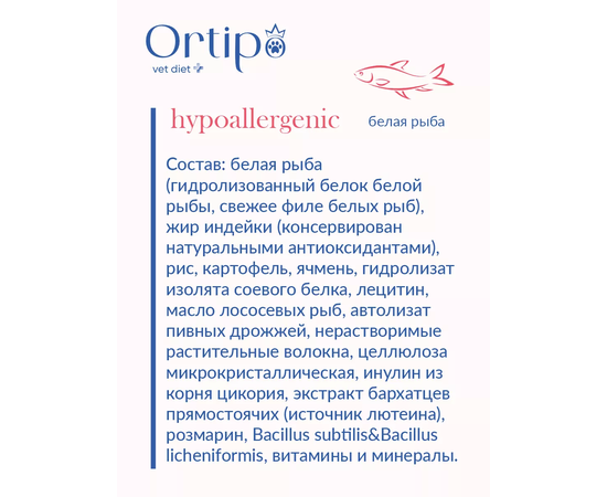 белая рыба (гидролизованный белок белой рыбы, свежее филе белых рыб), крахмал картофельный, жир индейки (консервирован натуральными антиоксидантами), гидролизат изолята соевого белка, масло лососевых рыб, автолизат пивных дрожжей, нерастворимые растительные волокна, лецитин, целлюлоза микрокристаллическая, инулин из корня цикория, экстракт бархатцев прямостоячих (источник лютеина), розмарин, Bacillus subtilis&Bacillus licheniformis, витамины и минералы