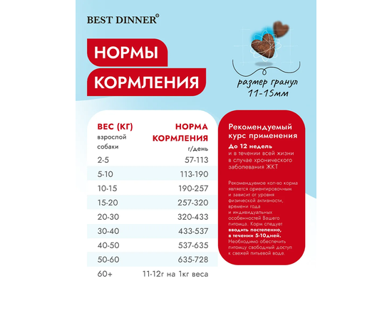 Рекомендуемое количество корма является ориентировочным и зависит от времени года, физической активности и индивидуальных особенностей животного.