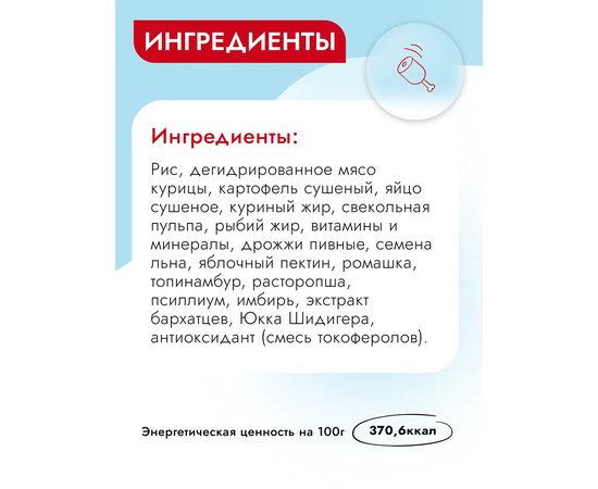 Рис, дегидрированное мясо курицы, картофель сушёный, яйцо сушёное, куриный жир, свекольная пульпа, рыбий жир, витамины и минералы, дрожжи пивные, семена льна, яблочный пектин, ромашка, топинамбур, расторопша, псиллиум, имбирь, Юкка Шидигера, экстракт бархатцев, антиоксидант (смесь токоферолов).