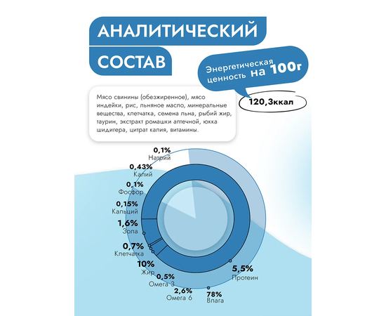 Состав: мясо свинины (обезжиренное), мясо индейки, рис, льняное масло, минеральные вещества, клетчатка, семена льна, рыбий жир, таурин, экстракт ромашки аптечной, юкка шидигера, цитрат калия, витамины.