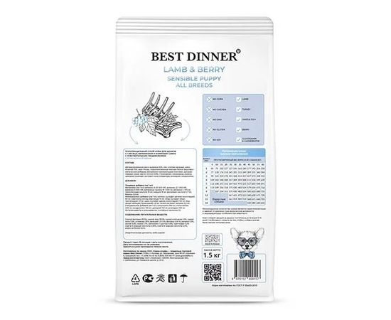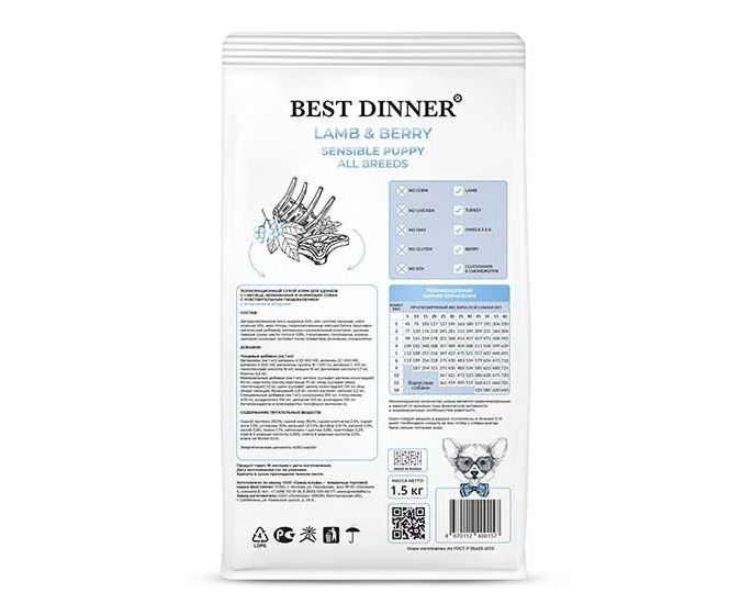 Сухой корм Best Dinner Dog & Puppy Sensible для собак, ягненок с ягодами, 1,5 кг