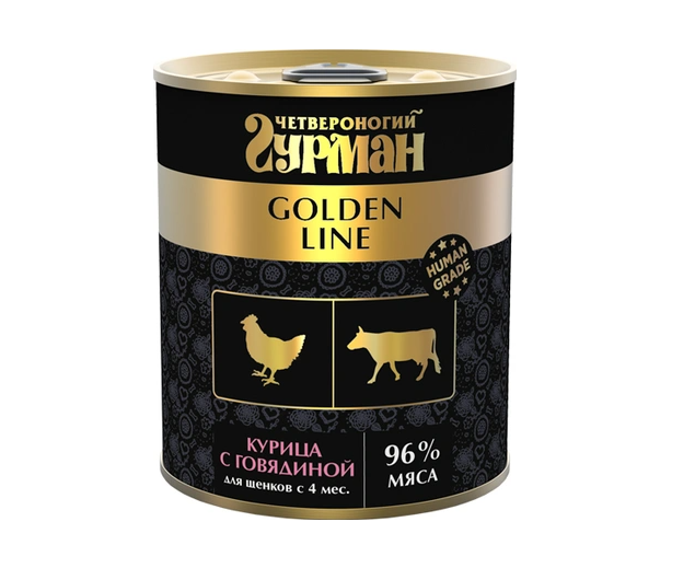 Четвероногий гурман “Golden line” для щенков – это влажный корм суперпремиум класса, приготовленный из мяса качества Human grade (пригодного в пищу человеку). Корм полностью натуральный – в его составе нет искусственных красителей, ароматизаторов, усилителей вкуса и ГМО.