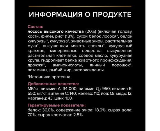 Лосось* (20%), рис* (18%), кукурузный глютен*, сухой белок лосося*, кукуруза*, животный жир, продукты переработки растительного сырья*, сухая мякоть свеклы*, кукурузный крахмал, минеральные вещества, целлюлоза, соевое масло,кукурузная крупа, вкусоароматическая кормовая добавка, дрожжи*, яичный порошок*, витамины, рыбий жир, антиоксиданты (токоферолы природного происхождения).