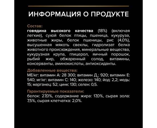 говядина (17%), пшеница, кукуруза, обезвоженный белок птицы, пшеничный глютен, животный жир, свекольная пульпа, рис (4%), минеральные вещества, кукурузная мука, пропиленгликоль, яичный порошок, рыбий жир, солодовая мука