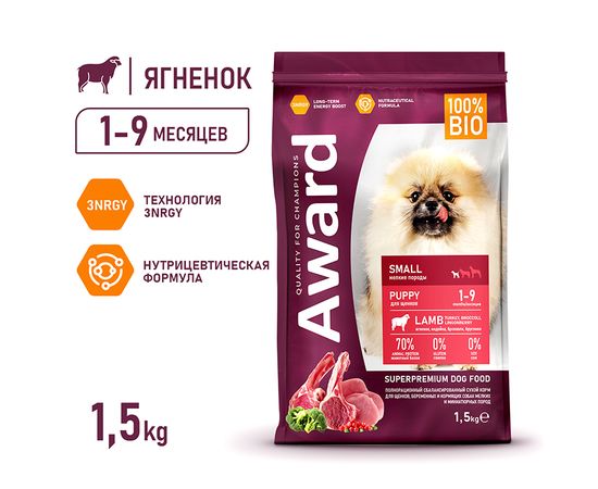 Сухой корм AWARD для щенков от 1 месяца, беременных и кормящих сук мелких пород, с ягненком и брусникой, 1.5кг
