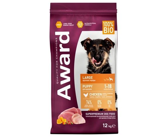 Сухой корм AWARD для щенков от 1 месяца крупных пород, с курицей, тыквой и шиповником, 12кг