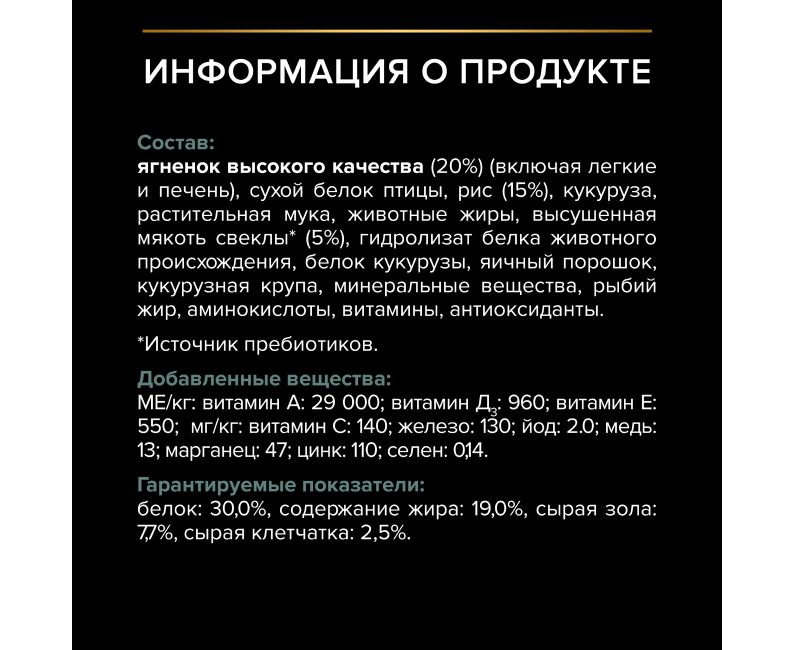 Ягненок (20%), сухой белок птицы, кукуруза, рис (10%), продукты переработки растительного сырья, животный жир, сухая мякоть свеклы, вкусоароматическая кормовая добавка, яичный порошок, кукурузный глютен, кукурузная крупа, минеральные вещества, рыбий жир, витамины, молозиво (0,1%), антиоксиданты (токоферолы природного происхождения).