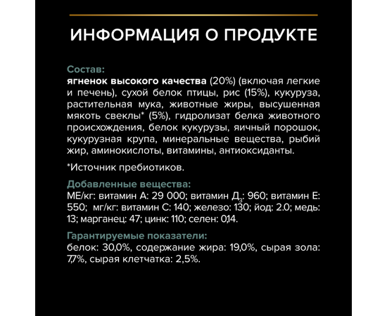 Ягненок (20%), сухой белок птицы, кукуруза, рис (10%), продукты переработки растительного сырья, животный жир, сухая мякоть свеклы, вкусоароматическая кормовая добавка, яичный порошок, кукурузный глютен, кукурузная крупа, минеральные вещества, рыбий жир, витамины, молозиво (0,1%), антиоксиданты (токоферолы природного происхождения).