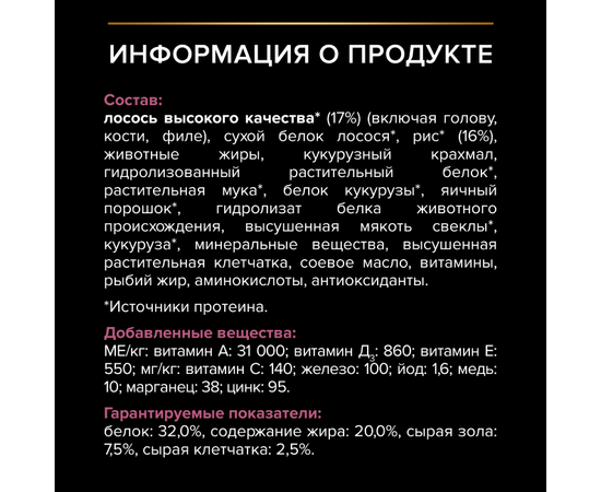 Лосось* (17%), сухой белок лосося*, рис* (16%), животный жир, кукурузный крахмал, кукурузный глютен*, продукты переработки растительного сырья*, яичный порошок*, сухой соевый белок*, вкусоароматическая кормовая добавка, сухая мякоть свеклы*, кукуруза*, минеральные вещества, целлюлоза, соевое масло, витамины, рыбий жир, антиоксиданты (токоферолы природного происхождения).