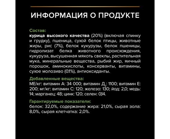 Курица (20%), пшеница, сухой белок птицы, животный жир, рис (7%), кукурузный глютен, пшеничный глютен, вкусоароматическая кормовая добавка, кукуруза, сухая мякоть свеклы, продукты переработки растительного сырья, минеральные вещества, яичный порошок, рыбий жир, консерванты, витамины, молозиво (0,1%), антиоксиданты (токоферолы природного происхождения).