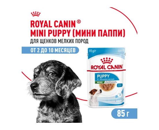 Корм консервированный полнорационный для щенков мелких пород (вес взрослой собаки до 10 кг) в возрасте до 10 месяцев MINI PUPPY 2-10 months (МИНИ ПАППИ 2-10 месяцев) ROYAL CANIN®, кусочки в соусе, подходящий для щенков мелких пород в возрасте до 10 месяцев, специально разработан с учетом потребностей в питательных веществах вашего щенка в период роста.