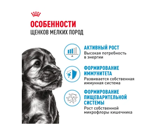 Формула рациона с повышенной калорийностью помогает удовлетворить высокие энергетические потребности щенков мелких пород.