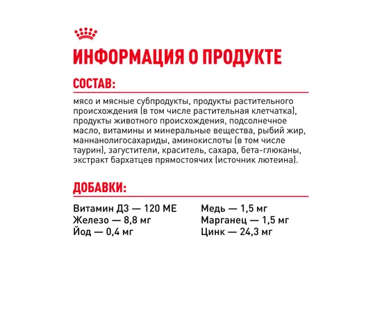 ИНГРЕДИЕНТЫ: мясо и мясные субпродукты, продукты растительного происхождения (в том числе растительная клетчатка), продукты животного происхождения, подсолнечное масло, витамины и минеральные вещества, рыбий жир, маннанолигосахариды, аминокислоты (в том числе таурин), загустители, краситель, сахара, бета-глюканы, экстракт бархатцев прямостоячих (источник лютеина)
