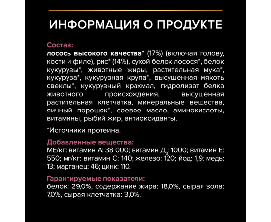 Лосось* (17%), рис* (14%), сухой белок лосося*, кукурузный глютен*, животный жир, кукуруза*, продукты переработки растительного сырья*, кукурузная крупа*, сухая мякоть свеклы*, кукурузный крахмал, вкусоароматическая кормовая добавка, целлюлоза, минеральные вещества, яичный порошок*, соевое масло, витамины, рыбий жир, антиоксиданты (токоферолы природного происхождения).