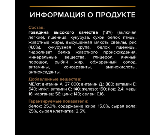 говядина (17%), пшеница, кукуруза, сухой белок птицы, животный жир, пшеничный глютен, сухая мякоть свеклы, кукурузная крупа, рис (4%), минеральные вещества, вкусоароматическая кормовая добавка, пропиленгликоль, яичный порошок, рыбий жир, солодовая мука.