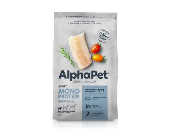 AlphaPet Superpremium Monoprotein корм для взрослых собак мелких пород с белой рыбой, 1,5кг