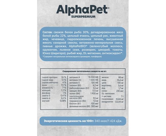 свежая белая рыба 30%, дегидрированное мясо белой рыбы 22%, цельный ячмень, цельный рис, животный жир, чечевица, гидролизованная печень, высушенная мякоть сахарной свеклы, витаминно-минеральная смесь, пивные дрожжи, AlphaPetBIO® (зеленогубый моллюск, одуванчик, льняное семя, розмарин, цикорий, томаты, Юкка Шидигера), рыбий жир, DL-метионин, антиоксидант*. *Содержит натуральные антиоксиданты (розмарин, токоферол).