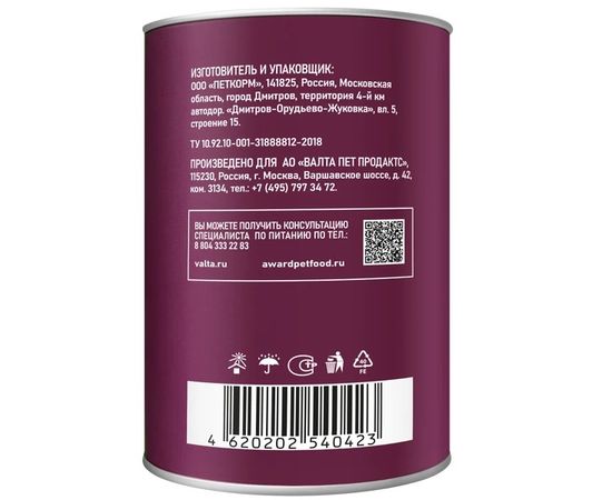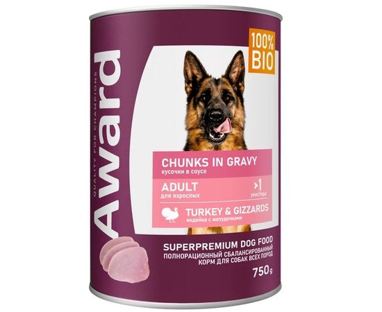 Консервы AWARD для взрослых собак, кусочки с индейкой и желудочками в соусе, 750г