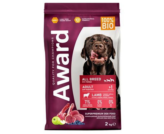 Сухой корм AWARD для взрослых собак всех пород, с ягненком, яблоком и черникой, 2кг