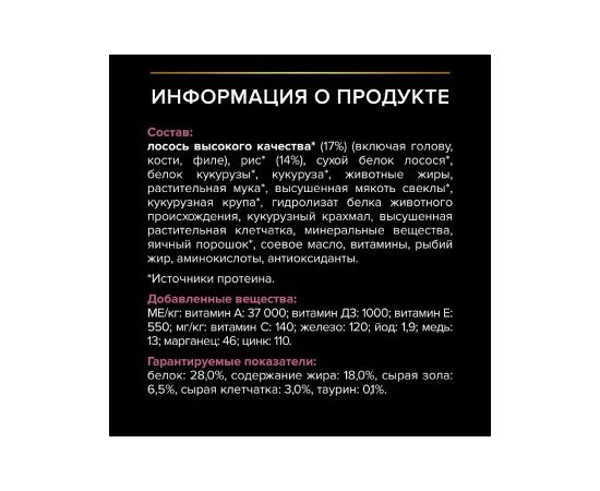 Лосось* (17%), рис* (14%), сухой белок лосося*, кукурузный глютен*, кукуруза*, животный жир, продукты переработки растительного сырья*, сухая мякоть свеклы*, кукурузная крупа*, вкусоароматическая кормовая добавка, кукурузный крахмал, целлюлоза, минеральные вещества, яичный порошок*, соевое масло, витамины, рыбий жир, аминокислоты, антиоксиданты (токоферолы природного происхождения).
