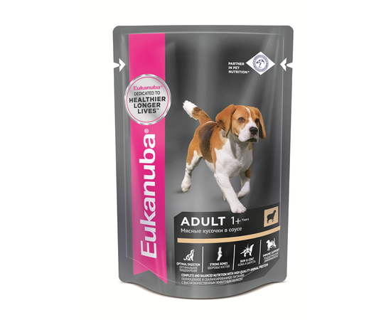 Корм консервированный полнорационный для взрослых собак всех пород с ягненком в соусе.